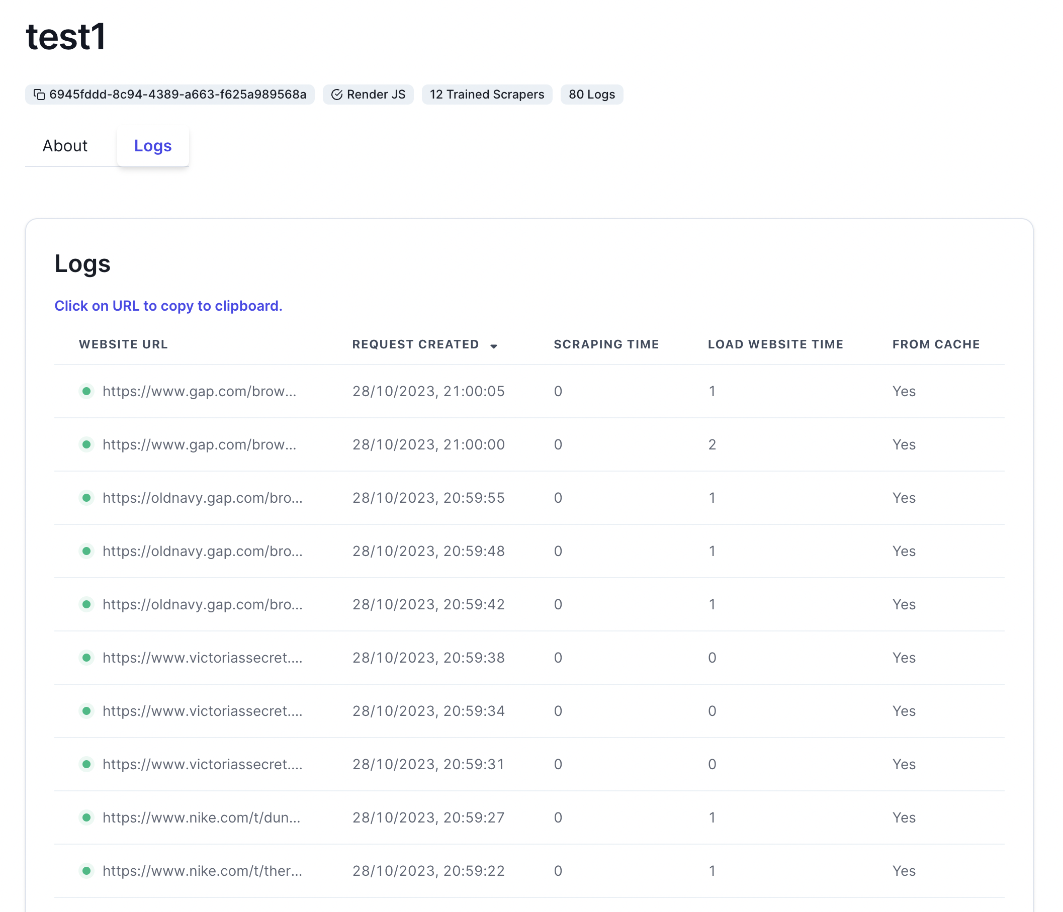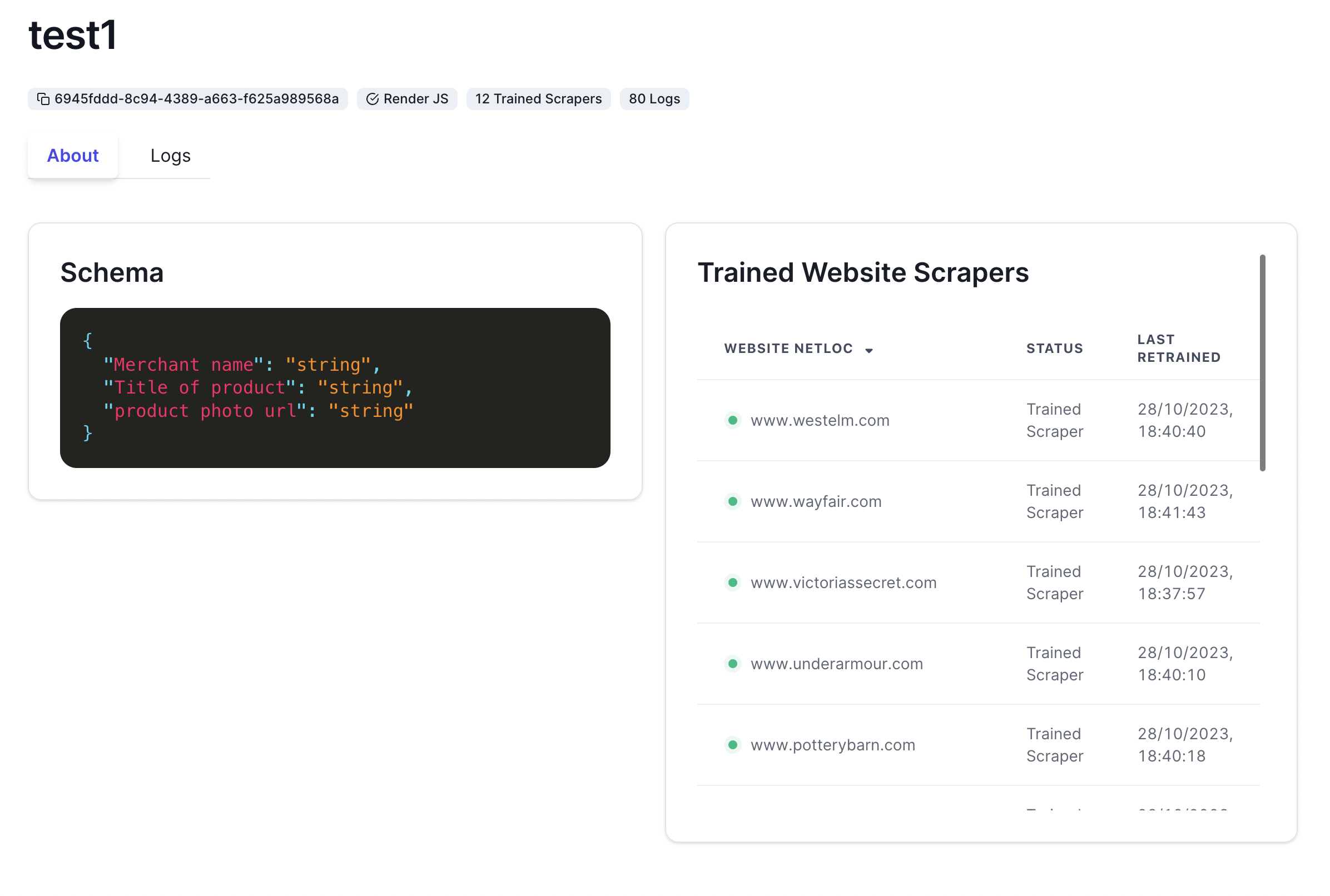You can monitor your scraper from the Web Transpose Scraper Dashboard.View Trained Scrapers